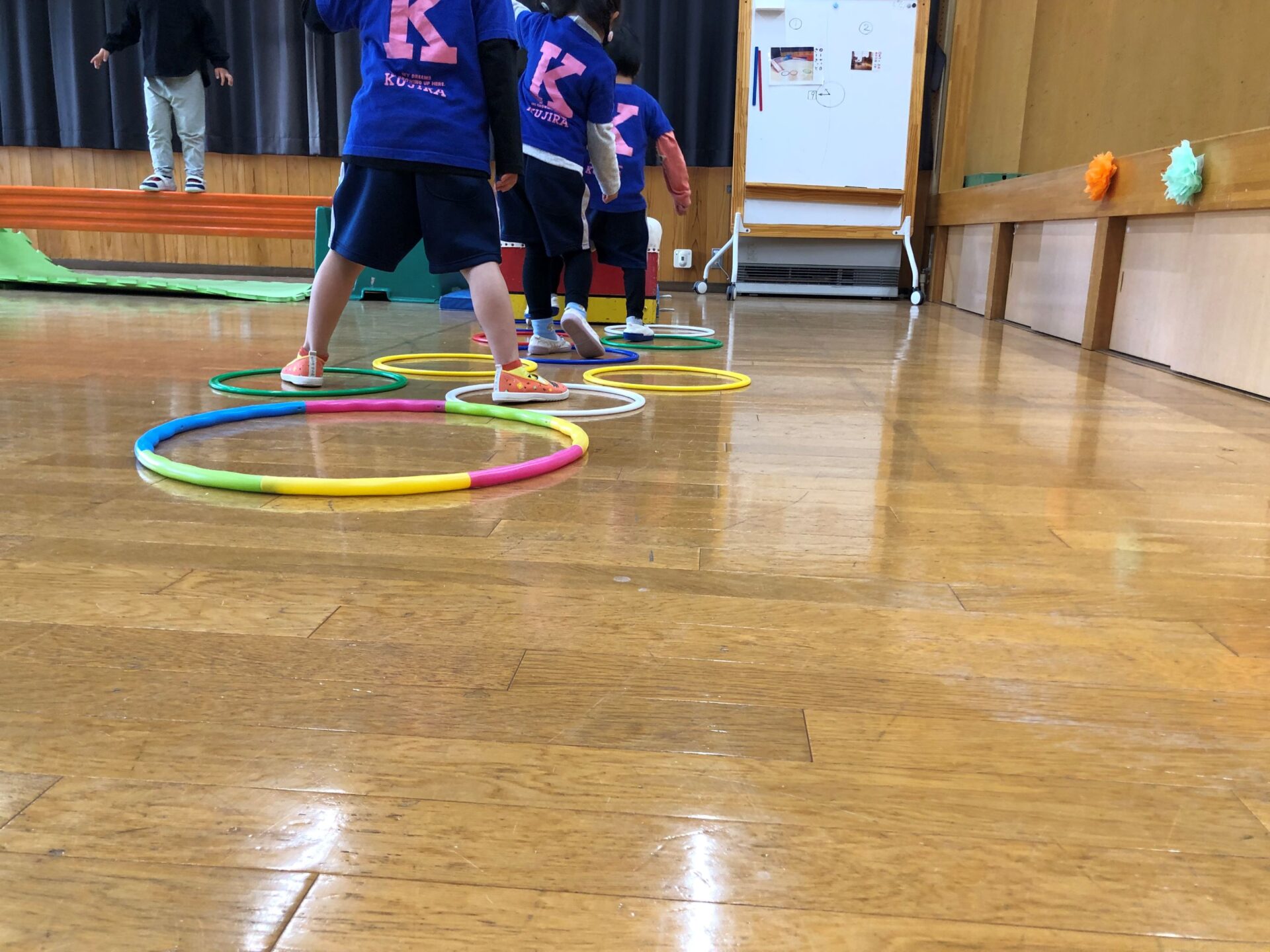 今日は雨だったので、ホールにつくってもらったサーキットで一緒に楽しく遊びました。