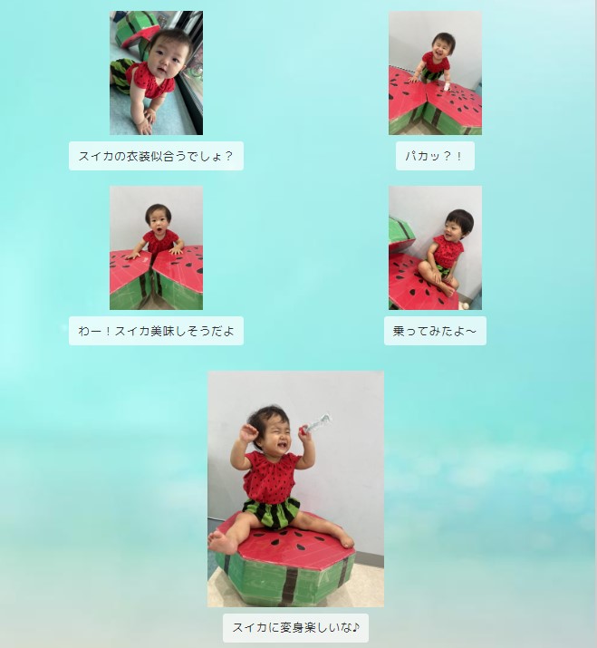 ご機嫌でスイカの衣装に着替え、大きなスイカを出すと少しびっくりしていましたが、