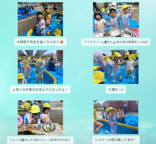 今後も泡遊びや色水遊びと、様々な形で水に触れ、心地良さを感じながら、夏の遊びを楽しんでいます!