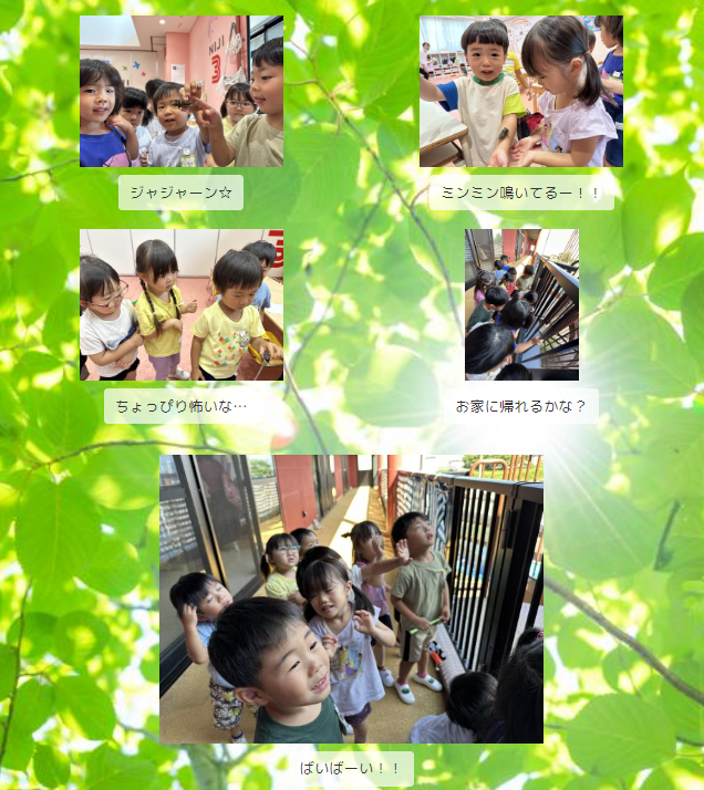触ることはちょっぴり怖かった子も、元気いっぱいに鳴くセミを見て「声大きい!」「飛びそう!」と近くで見ることができて大喜び☆