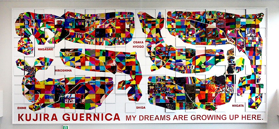 今年度のテーマは『碧のゲルニカ』、みんなで塗ったプラ板を使った作品となります。