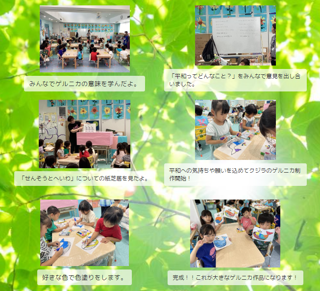 毎年、子どもたちと一緒に平和について考え、未来平和への希望を込めて全国のくじら保育園のみんなで協力して作品を完成させる取り組みです。パブロ・ピカソの絵画・ゲルニカと同じサイズ(3.49m×7.77m)のアート作品をみんなで完成させます。