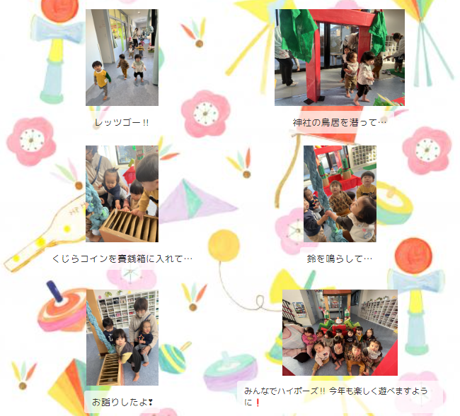 鳥居を潜ったり、鈴をジャラジャラと鳴らしたり、初詣の雰囲気をみんなで楽しみました♪