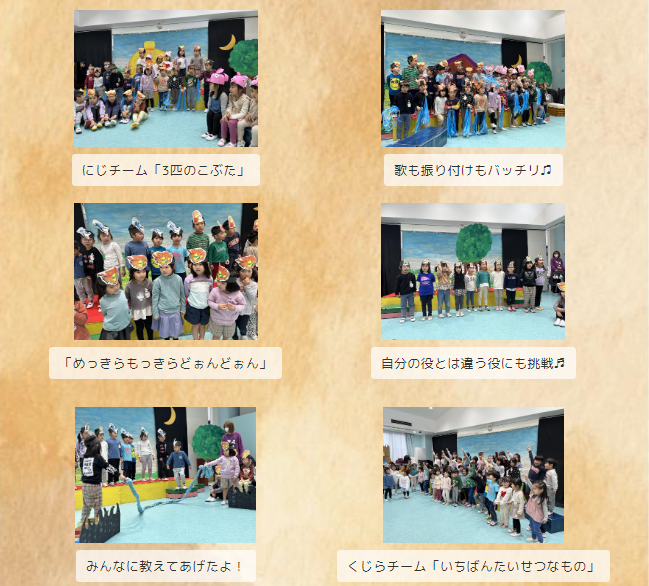 練習を見せてもらっている時から、他チームの劇に出てくる歌や振り付け、セリフを覚えて楽しんでいた子ども達。