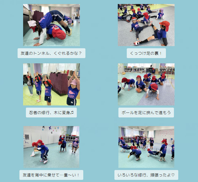 そらチーム最後の体操教室は忍者に変身!保育室に作られたコースを使っていろいろな修行に励みました。もうすぐ進級することを踏まえて長い説明を聞く時間も。4種類の修行の内容をよく聞き楽しんで体を動かすことができました!また4月からの体操教室を楽しみにしている子ども達…一年間いろいろな経験を積み、体も心も大きく成長したそらチームです♡今年一年たくさんのご理解ご協力をいただき、ありがとうございました!