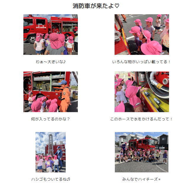 保育園に消防車がやってきました!駐車場に入ってきた消防車を見た時から大喜びの子ども達♡