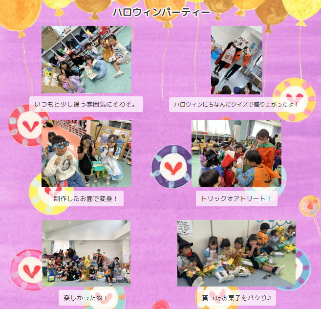 ハロウィンパーティーが始まると、ハロウィンの由来クイズや、シルエットクイズで盛り上がりました♪そして、今年はどんなおやつがもらえるのかな?と楽しみにしながら「トリックオアトリート!」と元気よく合言葉を言ってお菓子をもらう子ども達でした♪ 行事ごとに去年はこうだったよね〜と思い出しながら話す姿に成長を感じます♪
