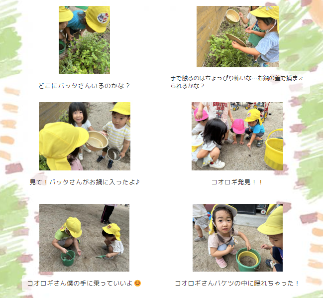 コオロギが跳んでいく後ろをみんなで追いかけていましたが、なかなか捕まえられず…あの手この手で捕まえようと奮闘している様子がとってもかわいらしかったです。